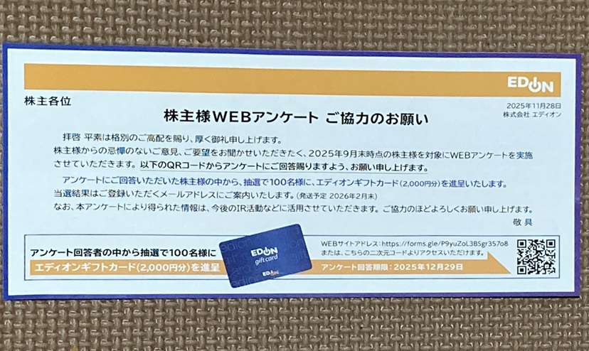 中間決算関係書類の中に株主WEBアンケートに協力することで、抽選で100名にエディオンギフトカード2,000円分が当たります!